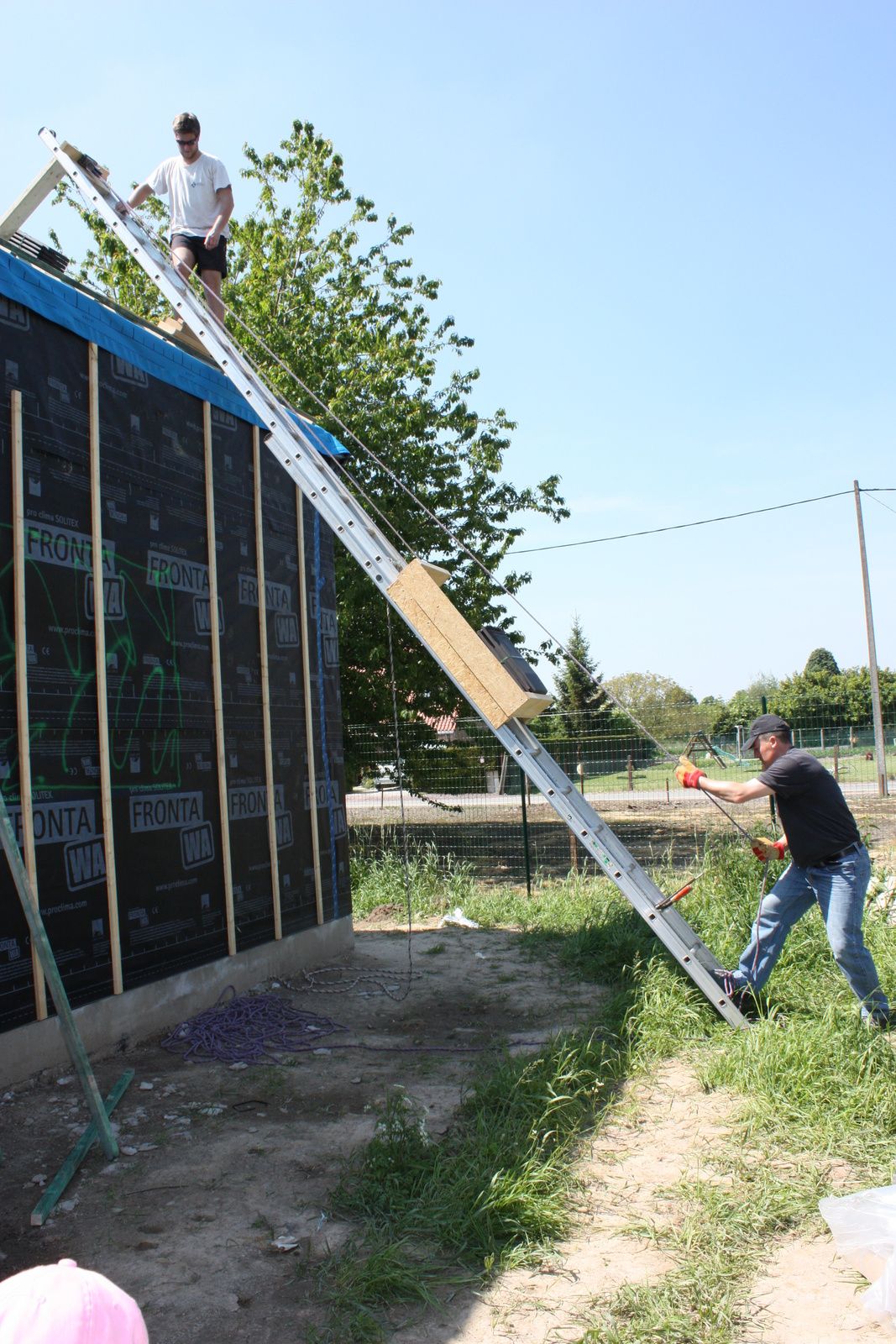 Monte Charge Monter Des Tuile Sur Le Toit Pour Couvrir La Toiture