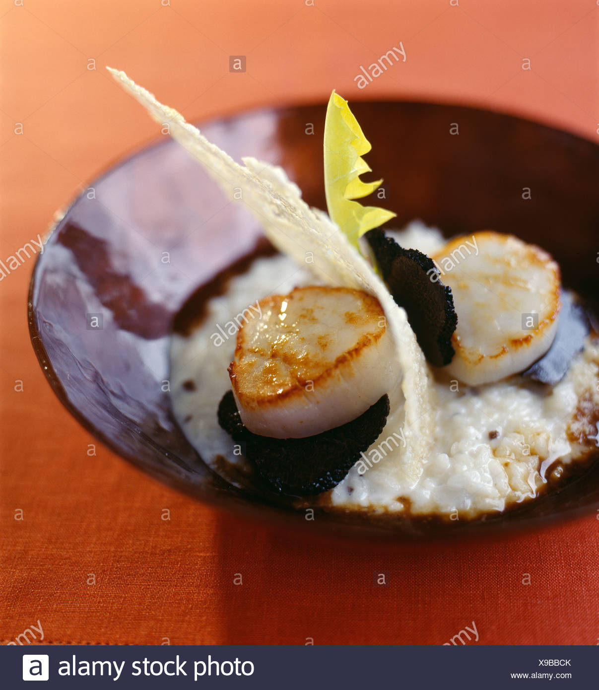 Scallops With Truffles And Parmesan Tuile Biscuit Stock