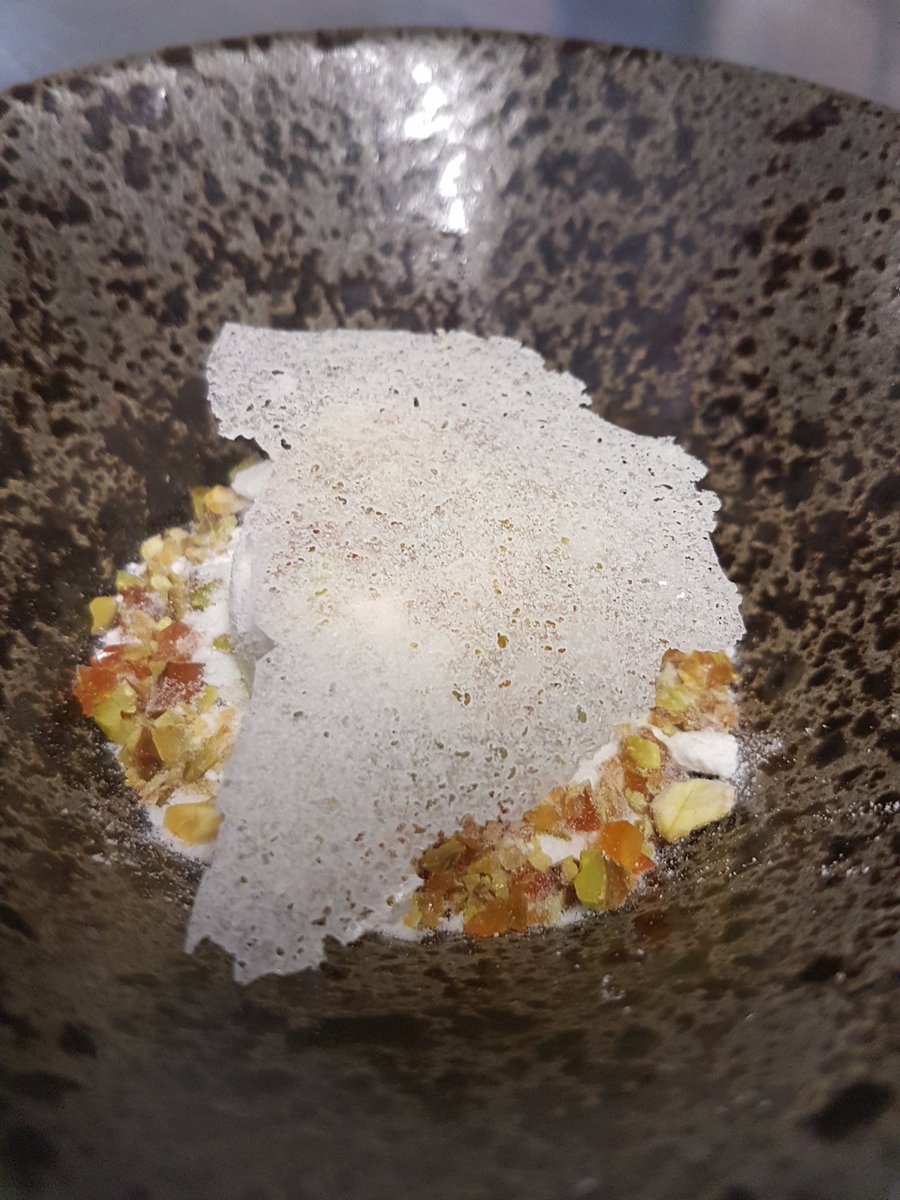 Coriander And White Chocolate Dome Mango Sorbet Coconut Espuma Sweet Puffed Rice