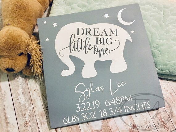 Custom Nursery Baby Shower Announcement Wood Sign Dream Big Little One Elephant Nursery Decor Birth Stats Sign Nursery Signs