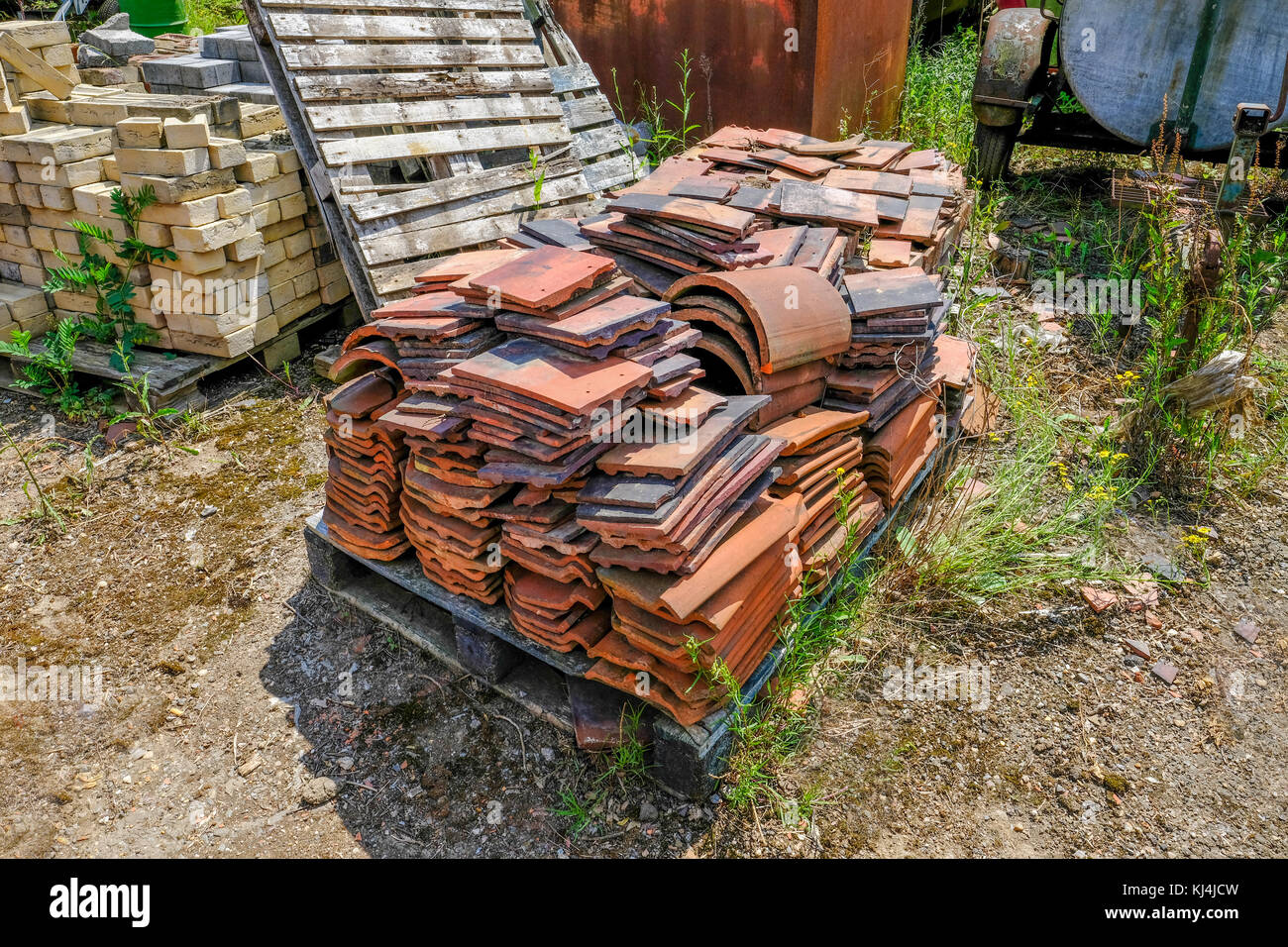Un Toit De Tuiles Ancienne Couchée Sur Une Palette Dans Une